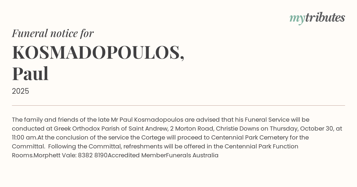 The family and friends of the late Mr Paul Kosmadopoulos are advised that his Funeral Service will be conducted at Greek Orthodox Parish of Saint Andrew, 2 Morton Road, Christie Downs on Thursday, October 30, at 11:00 am.