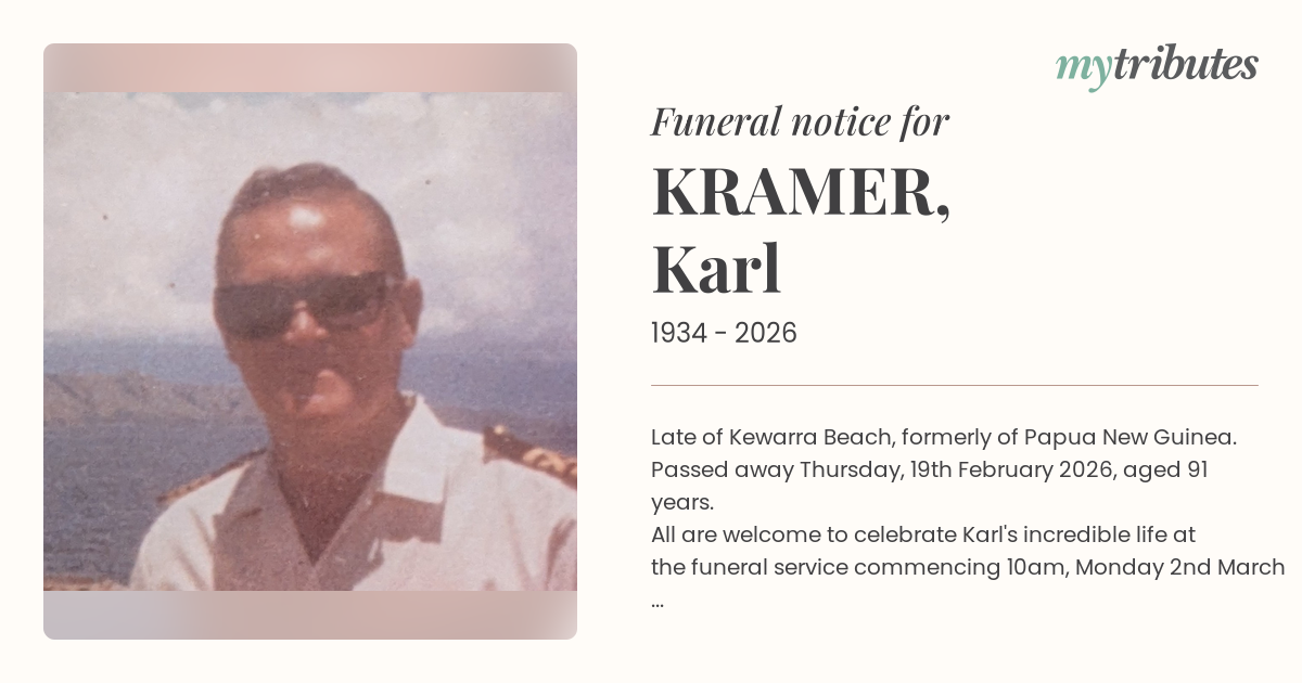Late of Kewarra Beach, formerly of Papua New Guinea. Passed away Thursday, 19th February 2026, aged 91 years. All are welcome to celebrate Karl's incredible life at the funeral service commencing 10am, Monday 2nd March 2026 at the Half Moon Bay Golf Course, 66 Wattle St, Yorkeys Knob.