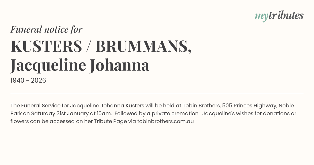 The Funeral Service for Jacqueline Johanna Kusters will be held at Tobin Brothers, 505 Princes Highway, Noble Park on Saturday 31st January at 10am.
