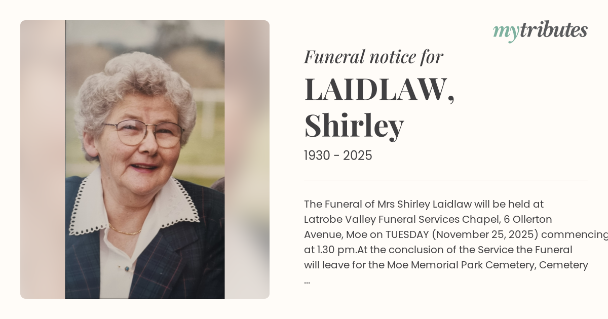 The Funeral of Mrs Shirley Laidlaw will be held at Latrobe Valley Funeral Services Chapel, 6 Ollerton Avenue, Moe on TUESDAY (November 25, 2025) commencing at 1.30 pm.