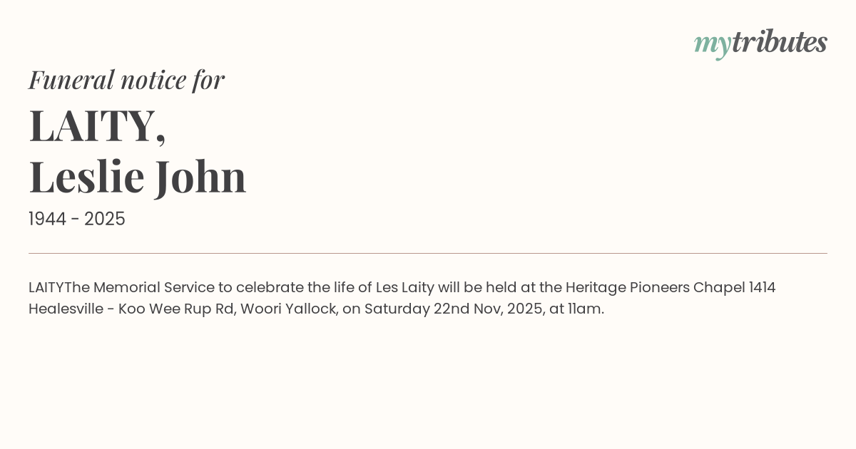 The Memorial Service to celebrate the life of Les Laity will be held at the Heritage Pioneers Chapel 1414 Healesville - Koo Wee Rup Rd, Woori Yallock, on Saturday 22nd Nov, 2025, at 11am.