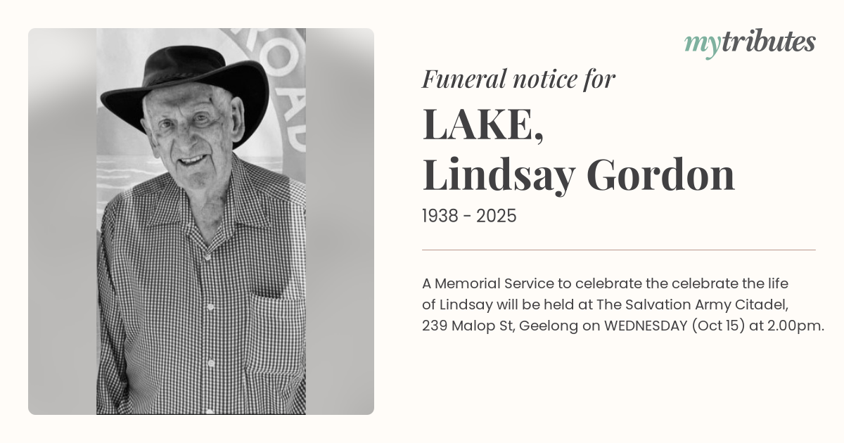 A Memorial Service to celebrate the celebrate the life of Lindsay will be held at The Salvation Army Citadel, 239 Malop St, Geelong on WEDNESDAY (Oct 15) at 2.00pm.
