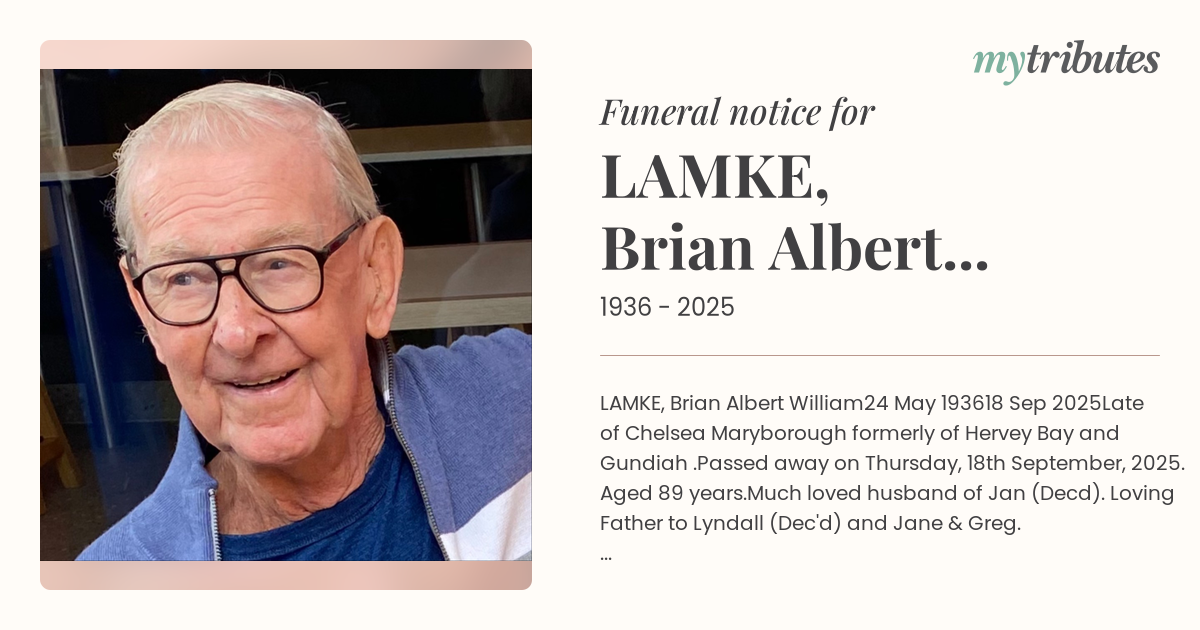 Much loved husband of Jan (Dec’d). Loving Father to Lyndall (Dec'd) and Jane & Greg. Cherished Pop to Luke and Casey. Much loved brother to Marj Thompson (Dec'd), June Wegner, Des Lamke (Dec'd), Rhonda and Kevin Skene. Loved by all family and friends.