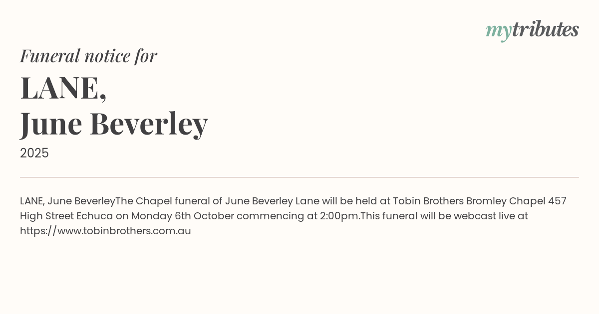 The Chapel funeral of June Beverley Lane will be held at Tobin Brothers Bromley Chapel 457 High Street Echuca on Monday 6th October commencing at 2:00pm.