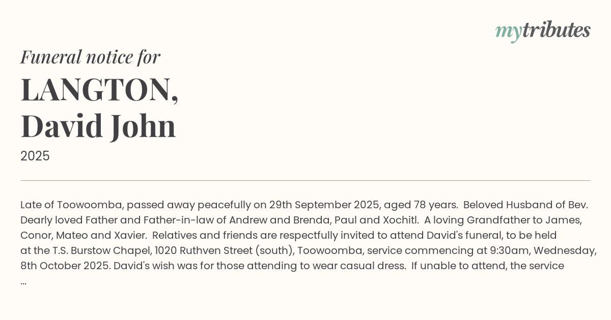 Relatives and friends are respectfully invited to attend David's funeral, to be held at the T.S. Burstow Chapel, 1020 Ruthven Street (south), Toowoomba, service commencing at 9:30am, Wednesday, 8th October 2025.