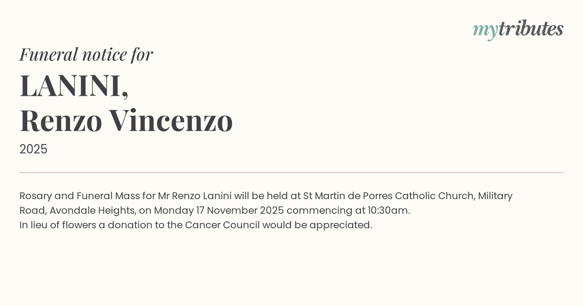 Rosary and Funeral Mass for Mr Renzo Lanini will be held at St Martin de Porres Catholic Church, Military Road, Avondale Heights, on Monday 17 November 2025 commencing at 10:30am.