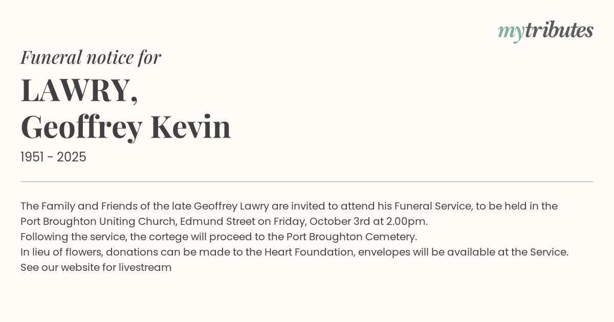 The Family and Friends of the late Geoffrey Lawry are invited to attend his Funeral Service, to be held in the Port Broughton Uniting Church, Edmund Street on Friday, October 3rd at 2.00pm.