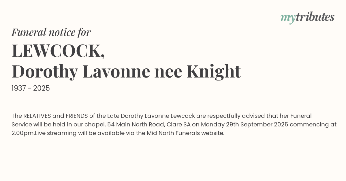 The RELATIVES and FRIENDS of the Late Dorothy Lavonne Lewcock are respectfully advised that her Funeral Service will be held in our chapel, 54 Main North Road, Clare SA on Monday 29th September 2025 commencing at 2.00pm.