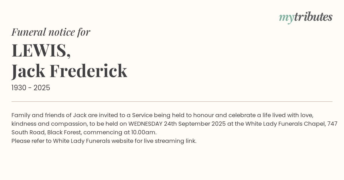 Family and friends of Jack are invited to a Service being held to honour and celebrate a life lived with love, kindness and compassion, to be held on WEDNESDAY 24th September 2025 at the White Lady Funerals Chapel, 747 South Road, Black Forest, commencing at 10.00am.