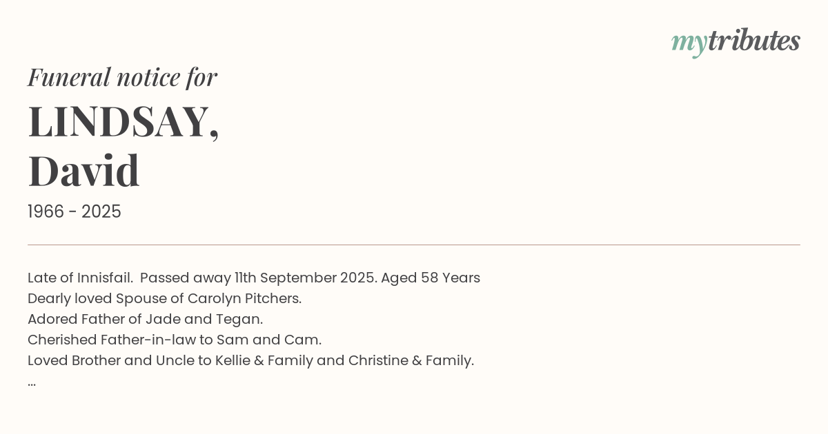 Late of Innisfail. Passed away 11th September 2025. Aged 58 Years