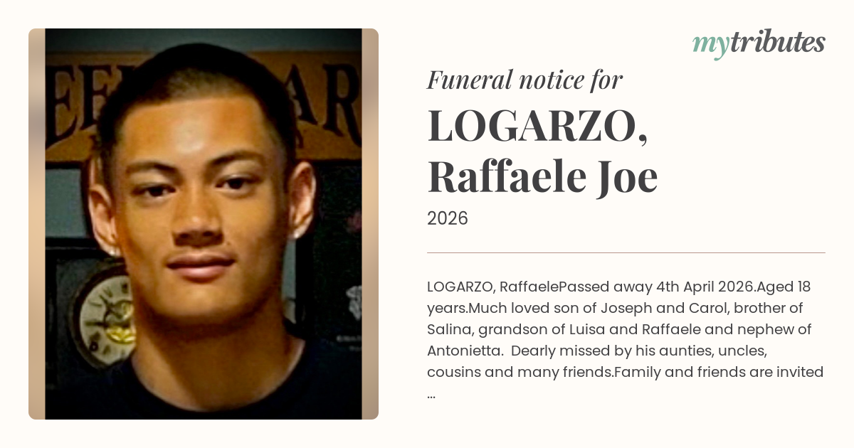 Much loved son of Joseph and Carol, brother of Salina, grandson of Luisa and Raffaele and nephew of Antonietta. Dearly missed by his aunties, uncles, cousins and many friends.