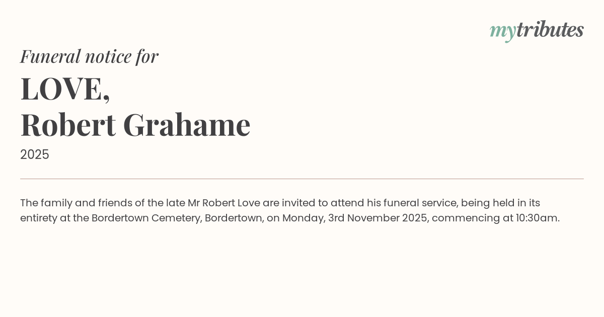 The family and friends of the late Mr Robert Love are invited to attend his funeral service, being held in its entirety at the Bordertown Cemetery, Bordertown, on Monday, 3rd November 2025, commencing at 10:30am.