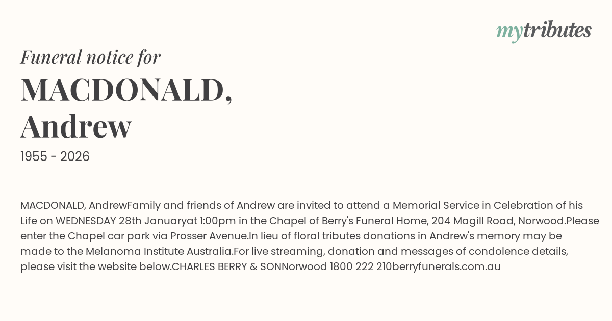 In lieu of floral tributes donations in Andrew's memory may be made to the Melanoma Institute Australia.