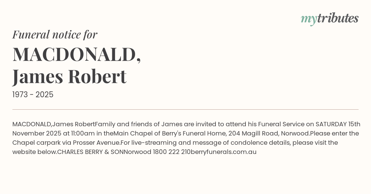 Family and friends of James are invited to attend his Funeral Service on SATURDAY 15th November 2025 at 11:00am in the