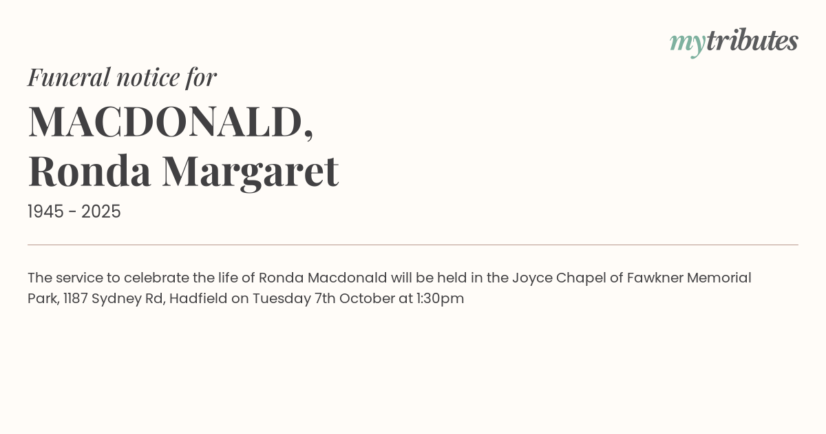 The service to celebrate the life of Ronda Macdonald will be held in the Joyce Chapel of Fawkner Memorial Park, 1187 Sydney Rd, Hadfield on Tuesday 7th October at 1:30pm