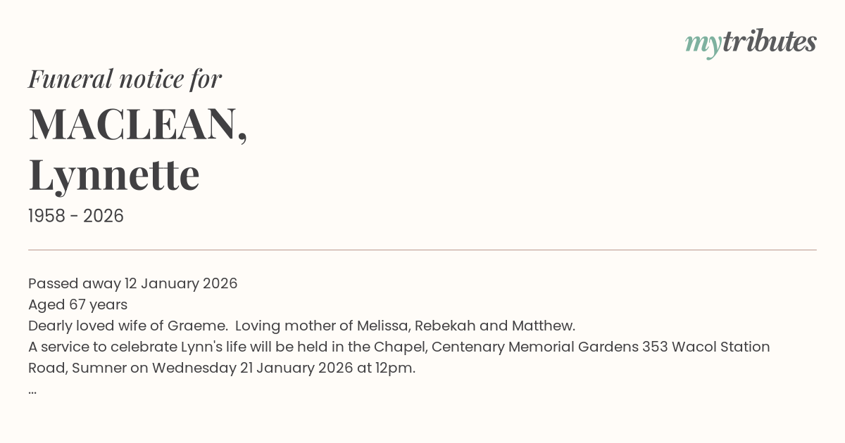 A service to celebrate Lynn's life will be held in the Chapel, Centenary Memorial Gardens 353 Wacol Station Road, Sumner on Wednesday 21 January 2026 at 12pm.
