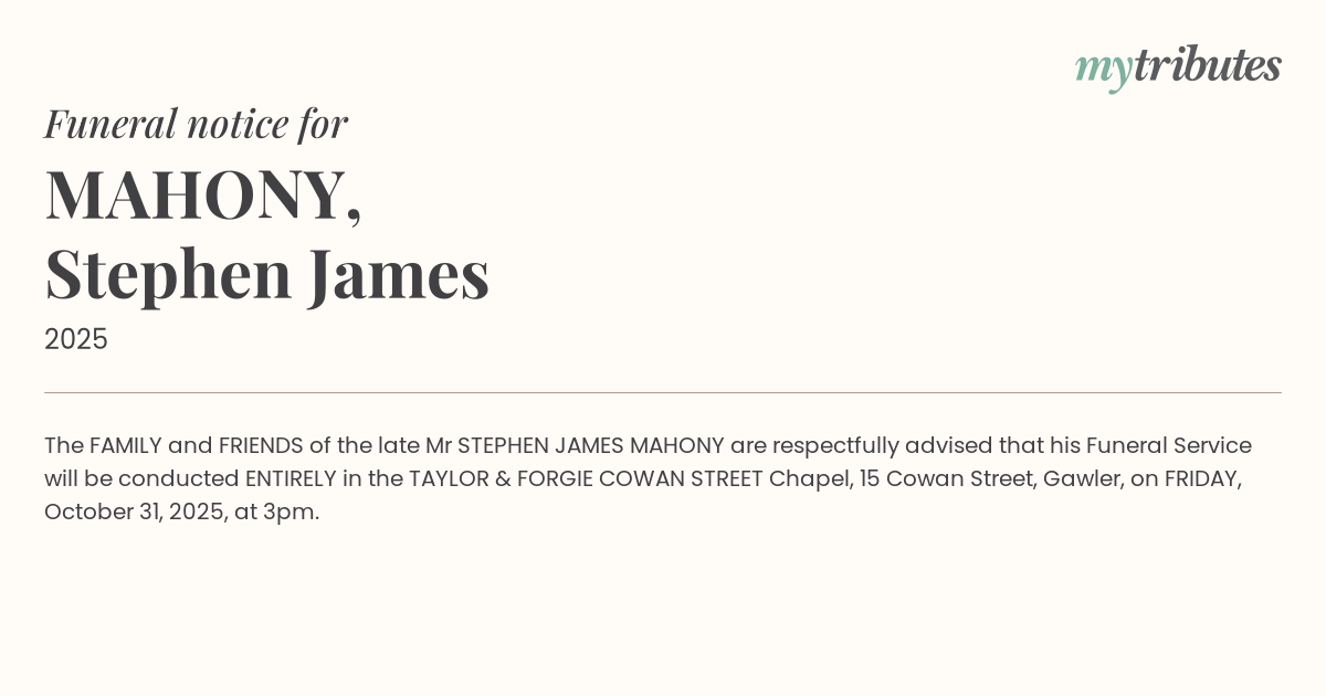 The FAMILY and FRIENDS of the late Mr STEPHEN JAMES MAHONY are respectfully advised that his Funeral Service will be conducted ENTIRELY in the TAYLOR & FORGIE COWAN STREET Chapel, 15 Cowan Street, Gawler, on FRIDAY, October 31, 2025, at 3pm.