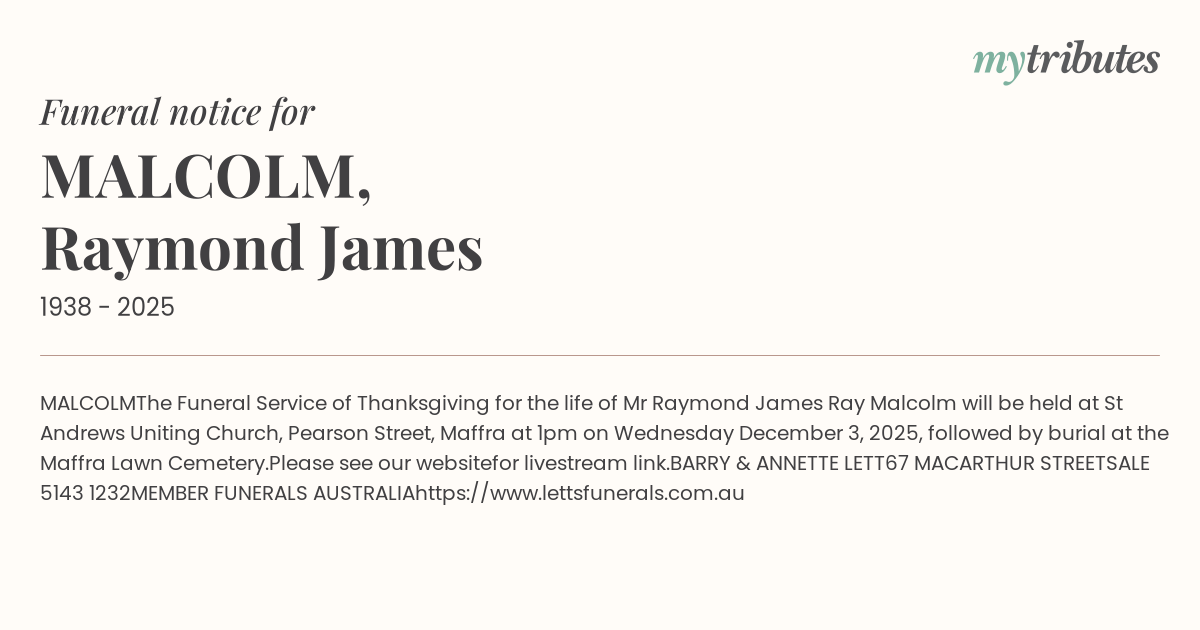 The Funeral Service of Thanksgiving for the life of Mr Raymond James ‘Ray’ Malcolm will be held at St Andrew’s Uniting Church, Pearson Street, Maffra at 1pm on Wednesday December 3, 2025, followed by burial at the Maffra Lawn Cemetery.