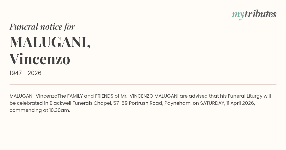 The FAMILY and FRIENDS of Mr. VINCENZO MALUGANI are advised that his Funeral Liturgy will be celebrated in Blackwell Funerals Chapel, 57-59 Portrush Road, Payneham, on SATURDAY, 11 April 2026, commencing at 10.30am.