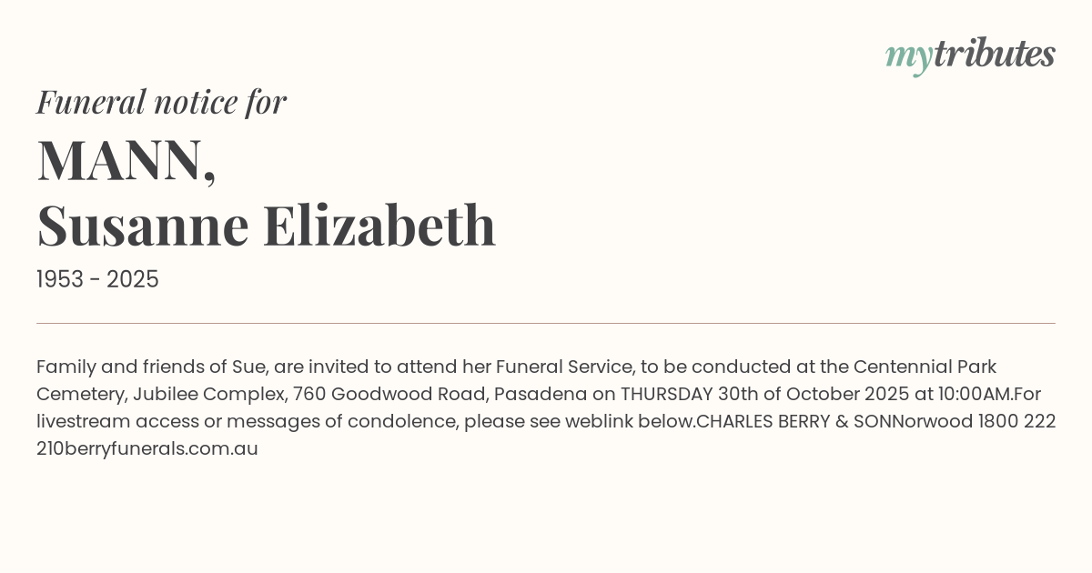 Family and friends of Sue, are invited to attend her Funeral Service, to be conducted at the Centennial Park Cemetery, Jubilee Complex, 760 Goodwood Road, Pasadena on THURSDAY 30th of October 2025 at 10:00AM.