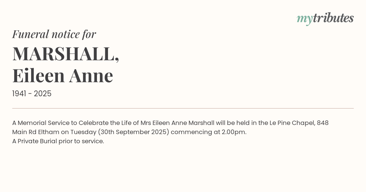 A Memorial Service to Celebrate the Life of Mrs Eileen Anne Marshall will be held in the Le Pine Chapel, 848 Main Rd Eltham on Tuesday (30th September 2025) commencing at 2.00pm.