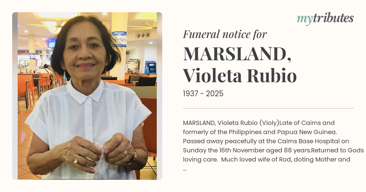 Relatives and Friends are respectfully invited to attend Violy’s funeral service to be held at the Catholic Mother of Good Counsel Church, North Cairns on Friday the 28th. November at 11:30 a.m.