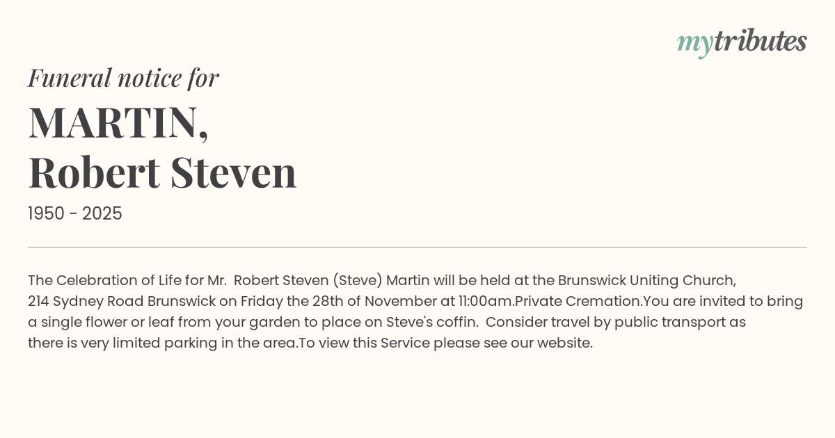 The Celebration of Life for Mr. Robert Steven (Steve) Martin will be held at the Brunswick Uniting Church, 214 Sydney Road Brunswick on Friday the 28th of November at 11:00am.