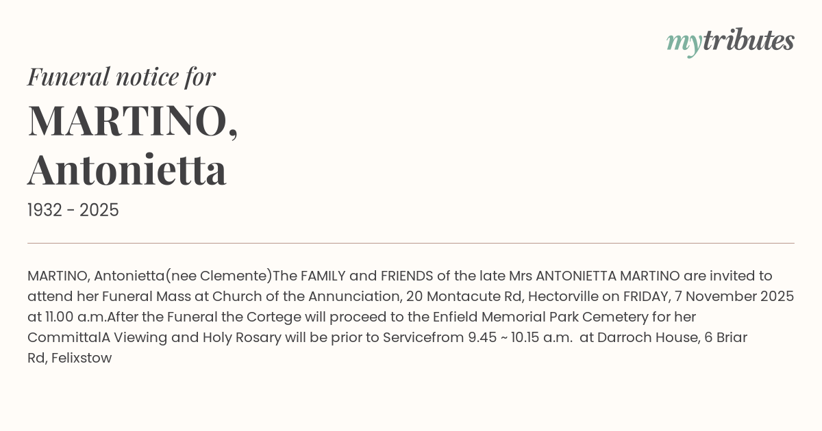 The FAMILY and FRIENDS of the late Mrs ANTONIETTA MARTINO are invited to attend her Funeral Mass at Church of the Annunciation, 20 Montacute Rd, Hectorville on FRIDAY, 7 November 2025 at 11.00 a.m.