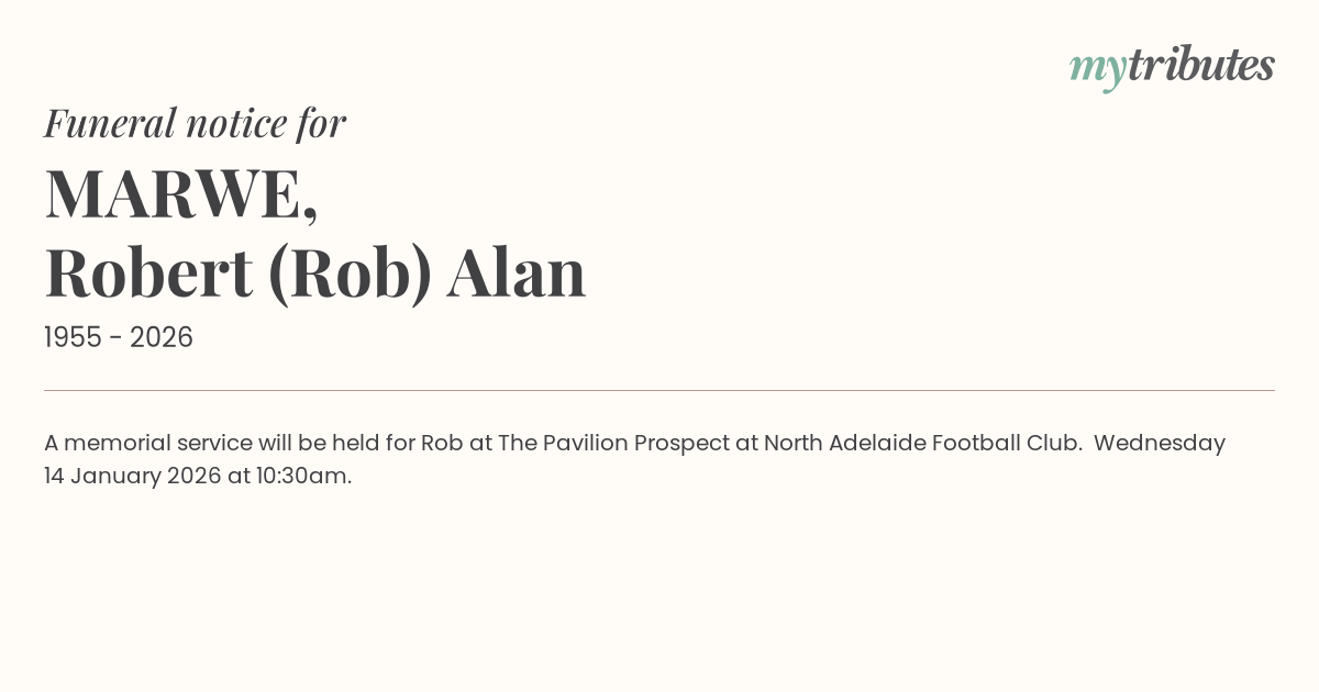 A memorial service will be held for Rob at The Pavilion Prospect at North Adelaide Football Club. Wednesday 14 January 2026 at 10:30am.