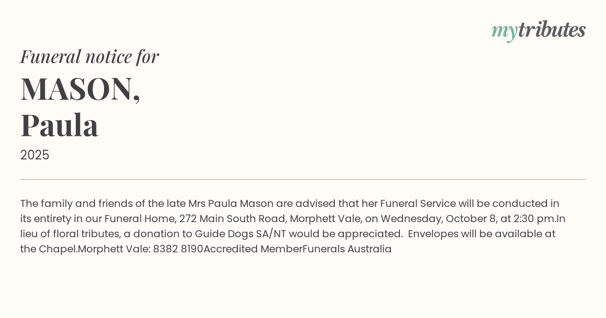 The family and friends of the late Mrs Paula Mason are advised that her Funeral Service will be conducted in its entirety in our Funeral Home, 272 Main South Road, Morphett Vale, on Wednesday, October 8, at 2:30 pm.