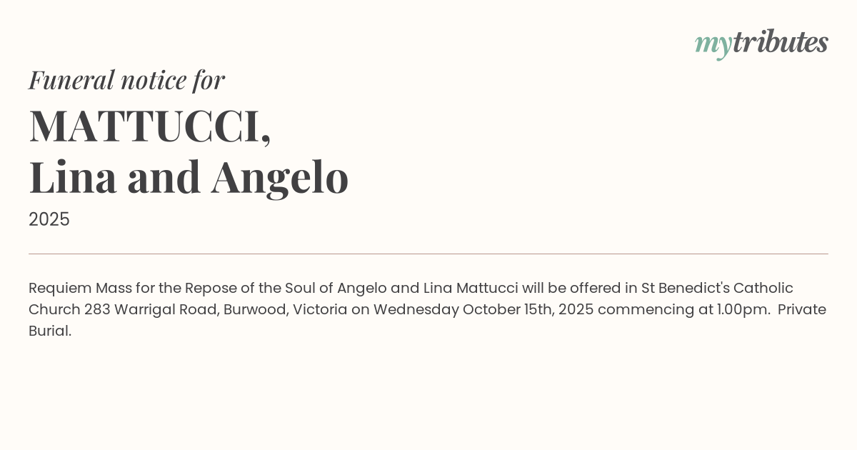 Requiem Mass for the Repose of the Soul of Angelo and Lina Mattucci will be offered in St Benedict's Catholic Church 283 Warrigal Road, Burwood, Victoria on Wednesday October 15th, 2025 commencing at 1.00pm. Private Burial.