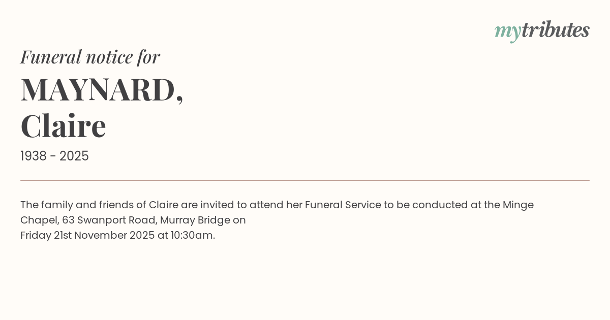 The family and friends of Claire are invited to attend her Funeral Service to be conducted at the Minge Chapel, 63 Swanport Road, Murray Bridge on