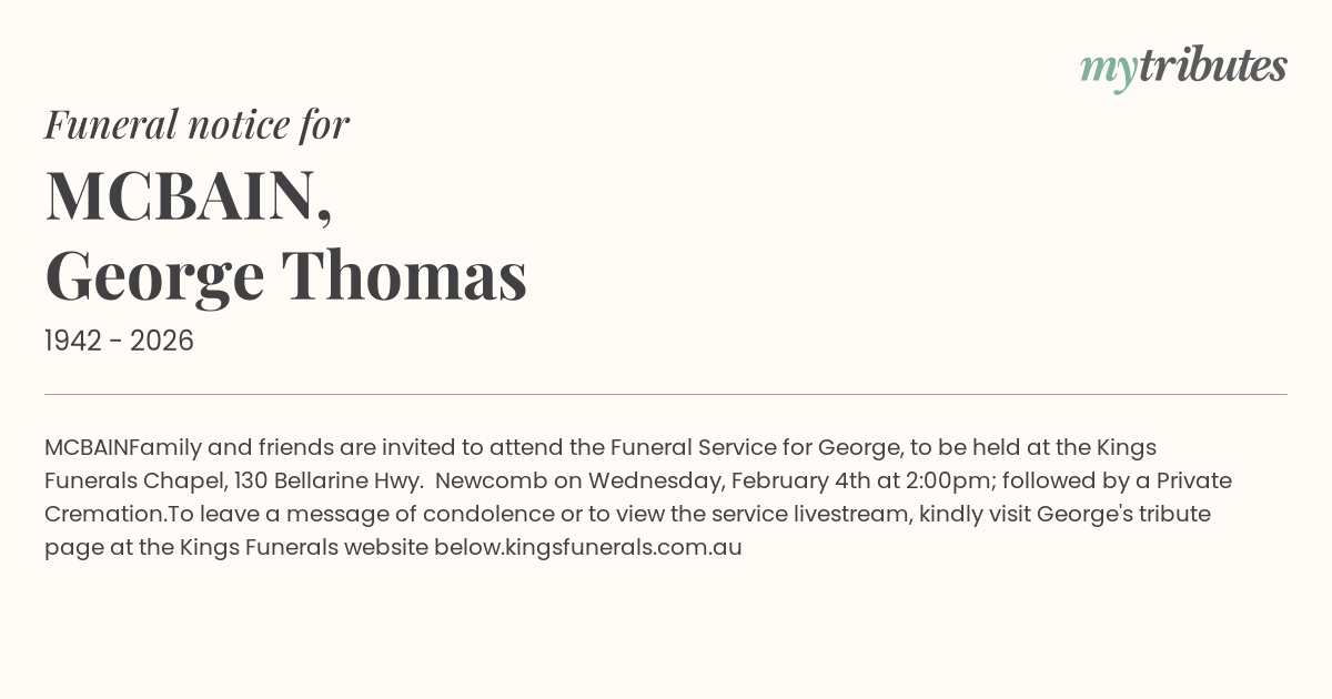 Family and friends are invited to attend the Funeral Service for George, to be held at the Kings Funerals Chapel, 130 Bellarine Hwy. Newcomb on