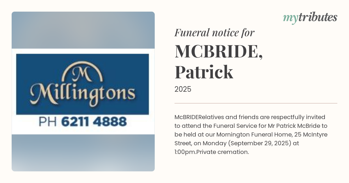 Relatives and friends are respectfully invited to attend the Funeral Service for Mr Patrick McBride to be held at our Mornington Funeral Home,
