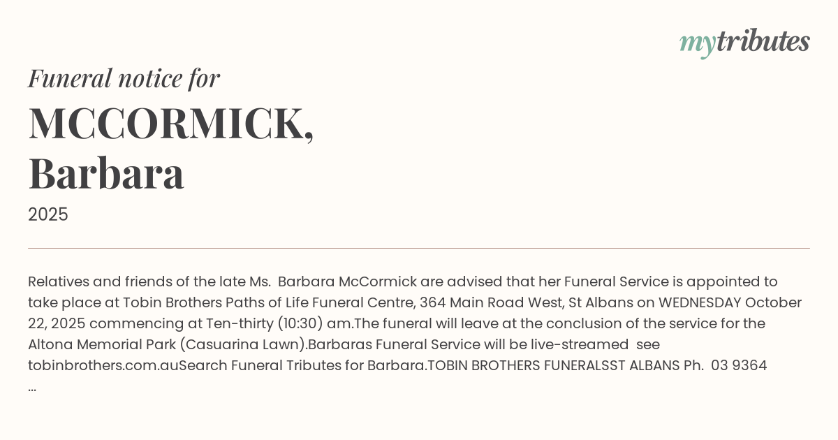 Relatives and friends of the late Ms. Barbara McCormick are advised that her Funeral Service is appointed to take place at Tobin Brothers Paths of Life Funeral Centre, 364 Main Road West, St Albans on WEDNESDAY October 22, 2025 commencing at Ten-thirty (10:30) am.