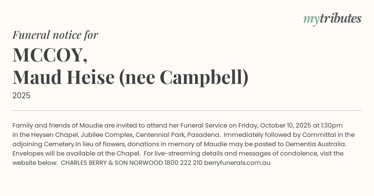 Family and friends of Maudie are invited to attend her Funeral Service on Friday, October 10, 2025 at 1:30pm in the Heysen Chapel, Jubilee Complex, Centennial Park, Pasadena. Immediately followed by Committal in the adjoining Cemetery.