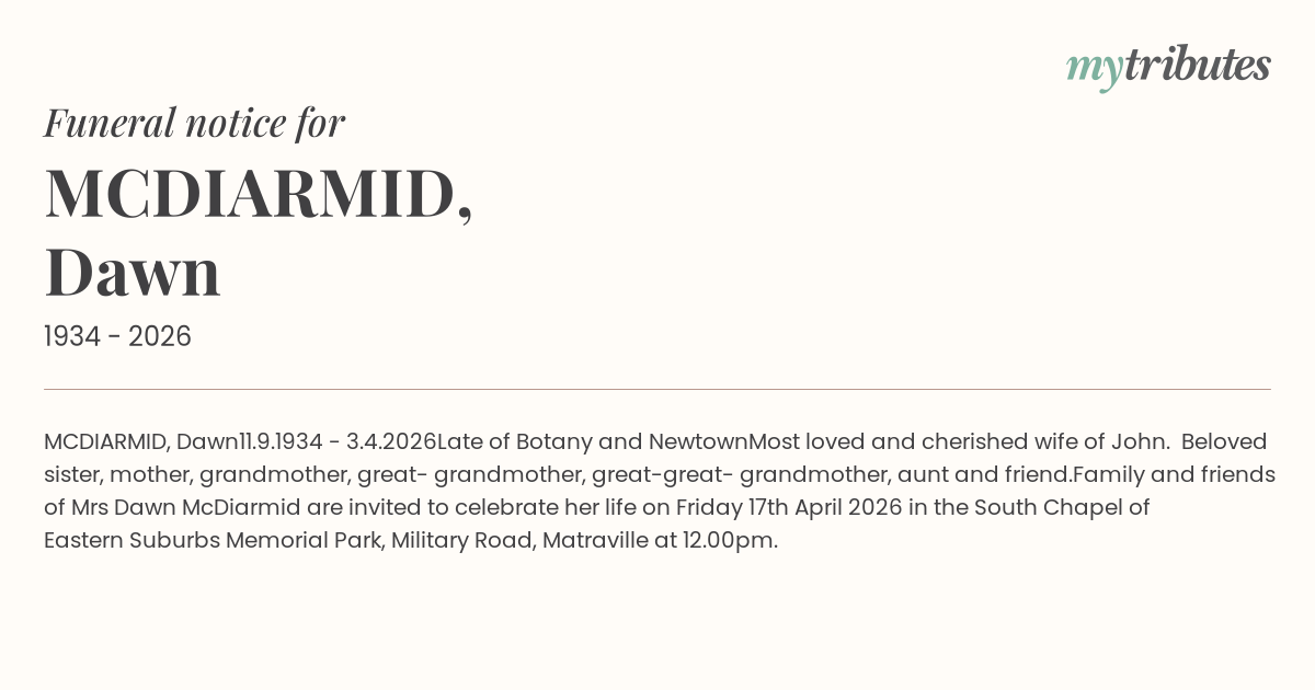 Family and friends of Mrs Dawn McDiarmid are invited to celebrate her life on Friday 17th April 2026 in the South Chapel of Eastern Suburbs Memorial Park, Military Road, Matraville at 12.00pm.