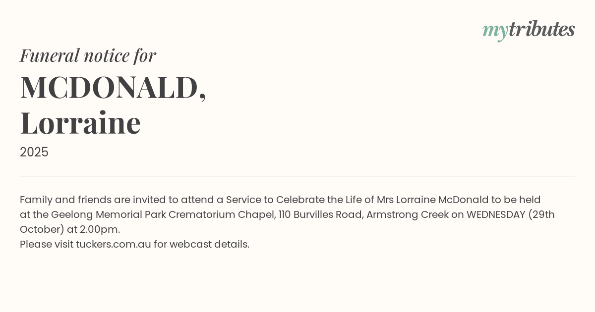 Family and friends are invited to attend a Service to Celebrate the Life of Mrs Lorraine McDonald to be held at the Geelong Memorial Park Crematorium Chapel, 110 Burvilles Road, Armstrong Creek on WEDNESDAY (29th October) at 2.00pm.