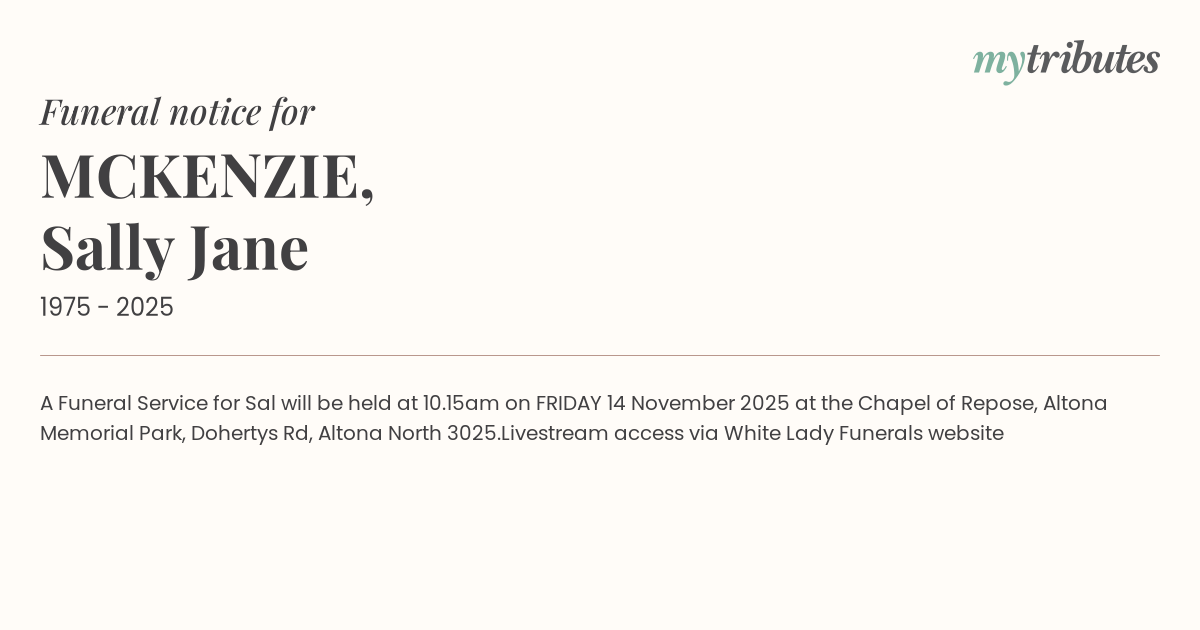 A Funeral Service for Sal will be held at 10.15am on FRIDAY 14 November 2025 at the Chapel of Repose, Altona Memorial Park, Dohertys Rd, Altona North 3025.