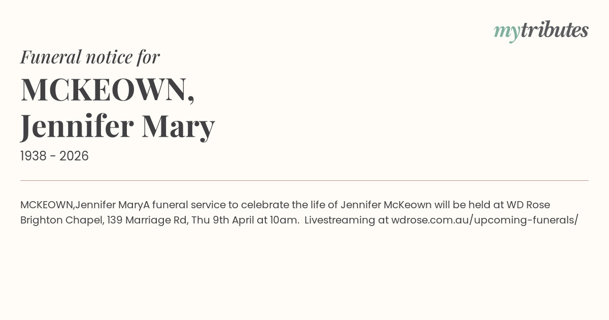 A funeral service to celebrate the life of Jennifer McKeown will be held at WD Rose Brighton Chapel, 139 Marriage Rd, Thu 9th April at 10am. Livestreaming at wdrose.com.au/upcoming-funerals/