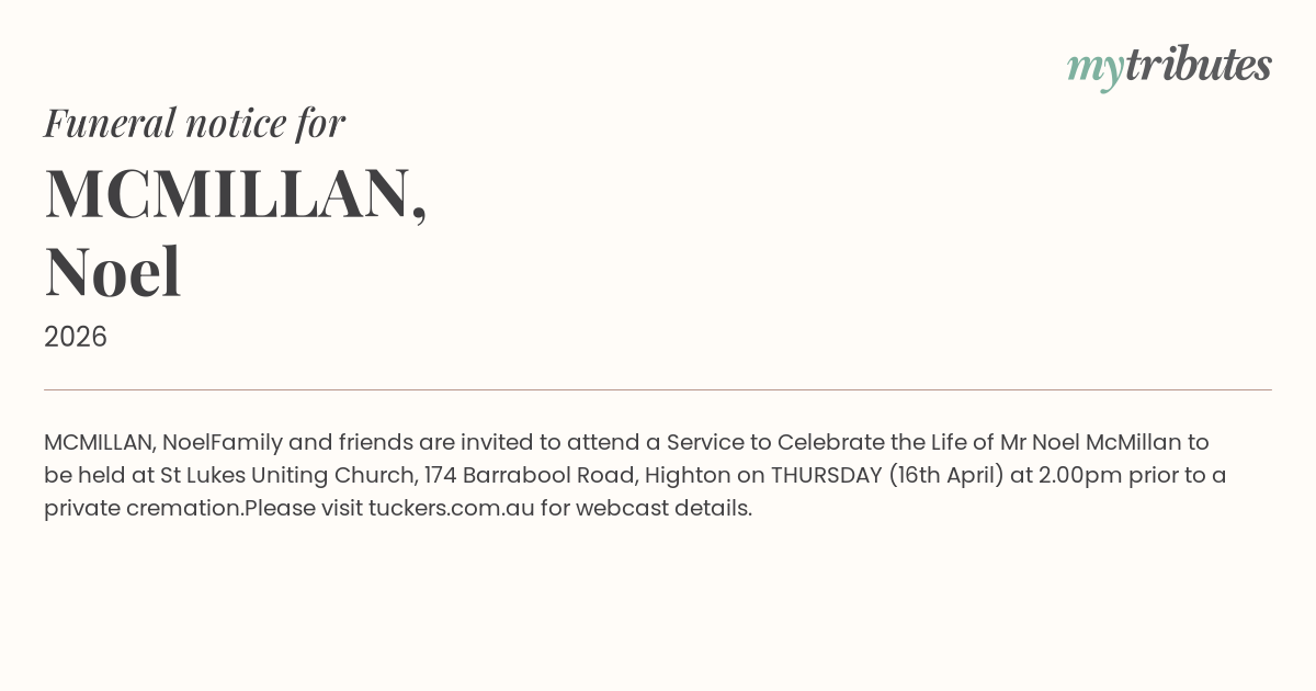 Family and friends are invited to attend a Service to Celebrate the Life of Mr Noel McMillan to be held at St Luke’s Uniting Church, 174 Barrabool Road, Highton on THURSDAY (16th April) at 2.00pm prior to a private cremation.