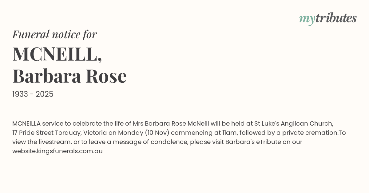 the life of Mrs Barbara Rose McNeill will be held at St Luke's Anglican Church, 17 Pride Street Torquay, Victoria on Monday (10 Nov) commencing at 11am, followed by a private cremation.