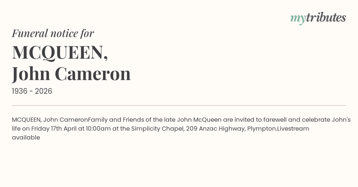 Family and Friends of the late John McQueen are invited to farewell and celebrate John's life on Friday 17th April at 10:00am at the