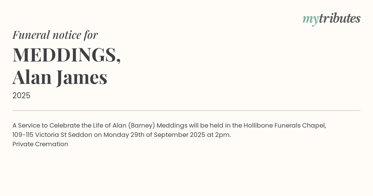 A Service to Celebrate the Life of Alan (Barney) Meddings will be held in the Hollibone Funerals Chapel, 109-115 Victoria St Seddon on Monday 29th of September 2025 at 2pm.