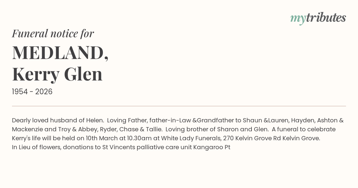 Dearly loved husband of Helen. Loving Father, father-in-Law &Grandfather to Shaun &Lauren, Hayden, Ashton & Mackenzie and Troy & Abbey, Ryder, Chase & Tallie. Loving brother of Sharon and Glen. A funeral to celebrate Kerry's life will be held on 10th March at 10.30am at White Lady Funerals, 270 Kelvin Grove Rd Kelvin Grove. In Lieu of flowers, donations to St Vincents palliative care unit Kangaroo Pt