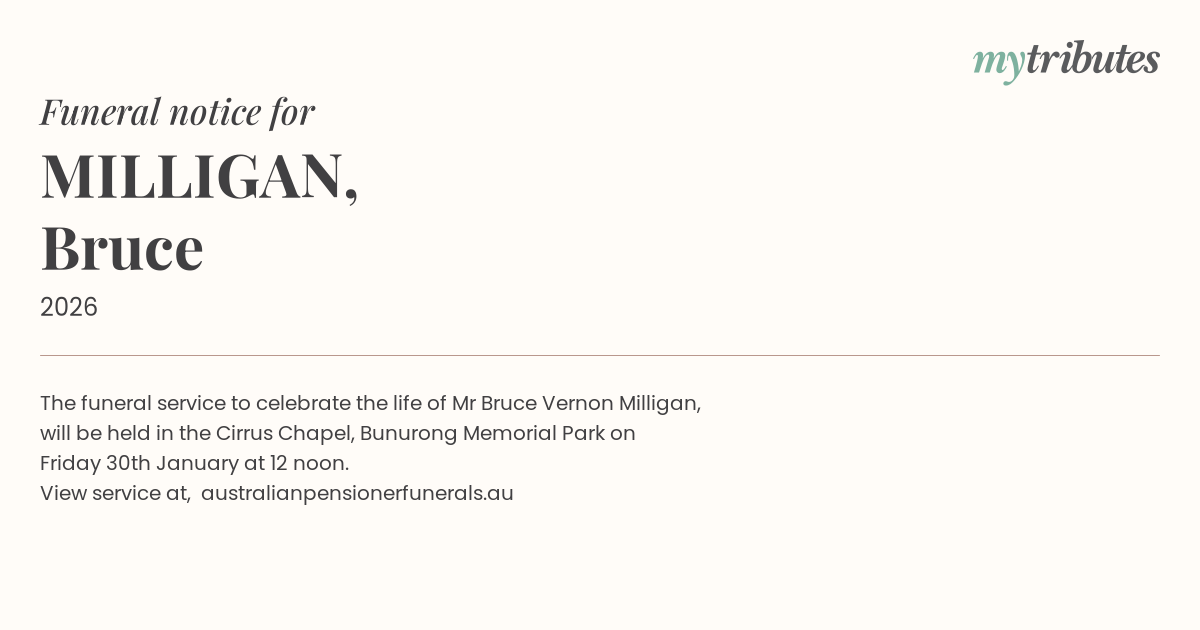 The funeral service to celebrate the life of Mr Bruce Vernon Milligan,