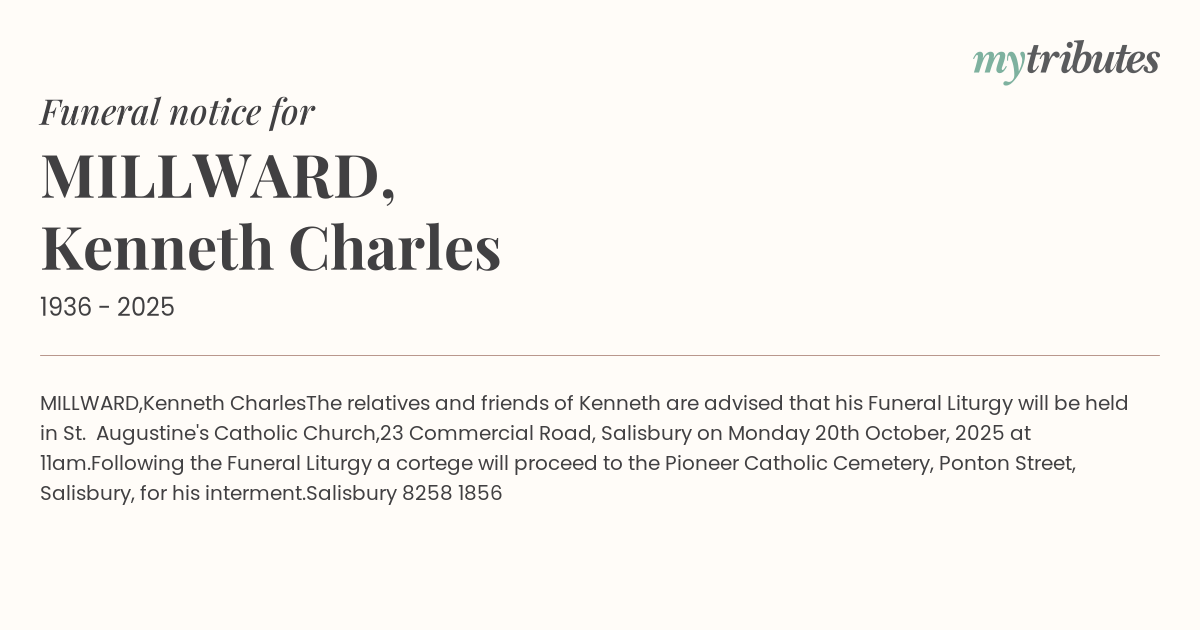 The relatives and friends of Kenneth are advised that his Funeral Liturgy will be held in St. Augustine's Catholic Church,