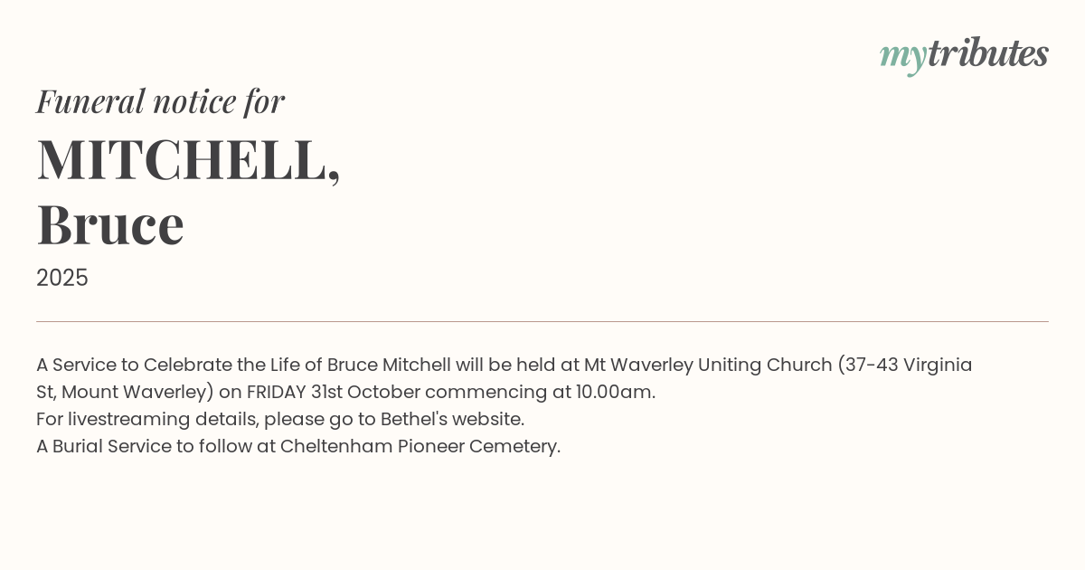 A Service to Celebrate the Life of Bruce Mitchell will be held at Mt Waverley Uniting Church (37-43 Virginia St, Mount Waverley) on FRIDAY 31st October commencing at 10.00am.