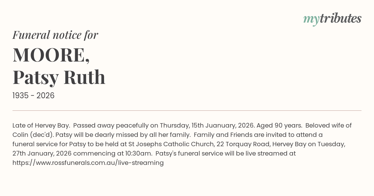 Late of Hervey Bay. Passed away peacefully on Thursday, 15th Juanuary, 2026. Aged 90 years. Beloved wife of Colin (dec'd). Patsy will be dearly missed by all her family.