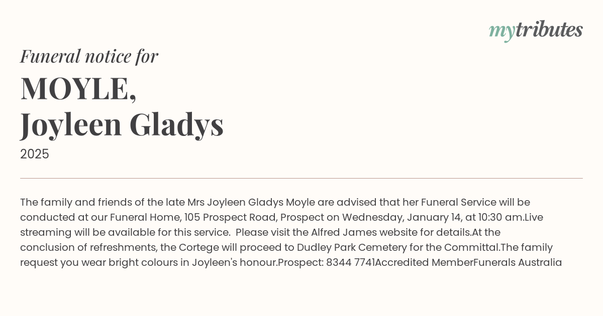 The family and friends of the late Mrs Joyleen Gladys Moyle are advised that her Funeral Service will be conducted at our Funeral Home, 105 Prospect Road, Prospect on Wednesday, January 14, at 10:30 am.